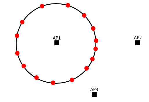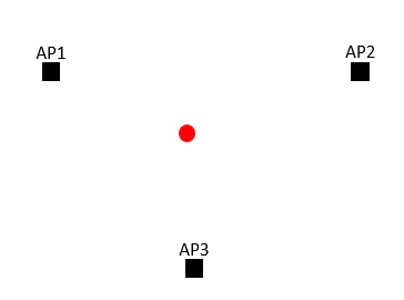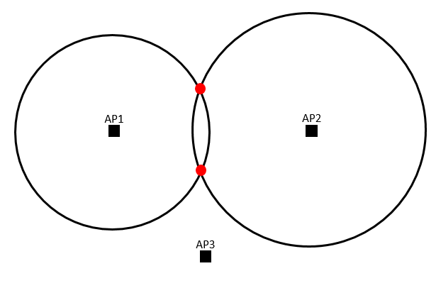 También llamado trilateración. Pero esto de la triangulación ¿Qué es? Si suponemos que la potencia recibida = distancia. Y si suponemos que las antenas generan un patrón de radiación en forma de esfera con centro en la propia antena. En este ejemplo, supongamos que conocemos la ubicación exacta en un plano de AP1, AP2 y AP3: