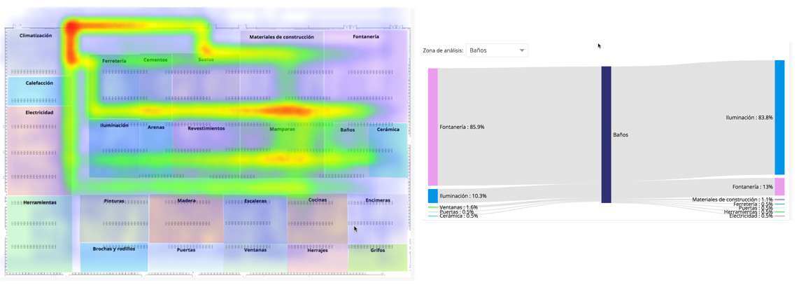 Al tener mucha más información e incluso más precisa, aplicamos técnicas de inteligencia artificial para realizar la reconstrucción de los posibles trayectos que realizan los clientes por el local. El siguiente paso es aplicar técnicas de agrupamiento para identificar patrones y ver como se comportan en sus recorridos. Esto tiene mucho sentido ya que el recorrido que efectúa un electricista (por ejemplo, en un almacén de construcción) será muy diferente al que realiza un pintor (simplificando). De esta forma tendremos grupos de personas al que podremos aplicar mapas de calor, interacción en zonas y flujo de clientes.
