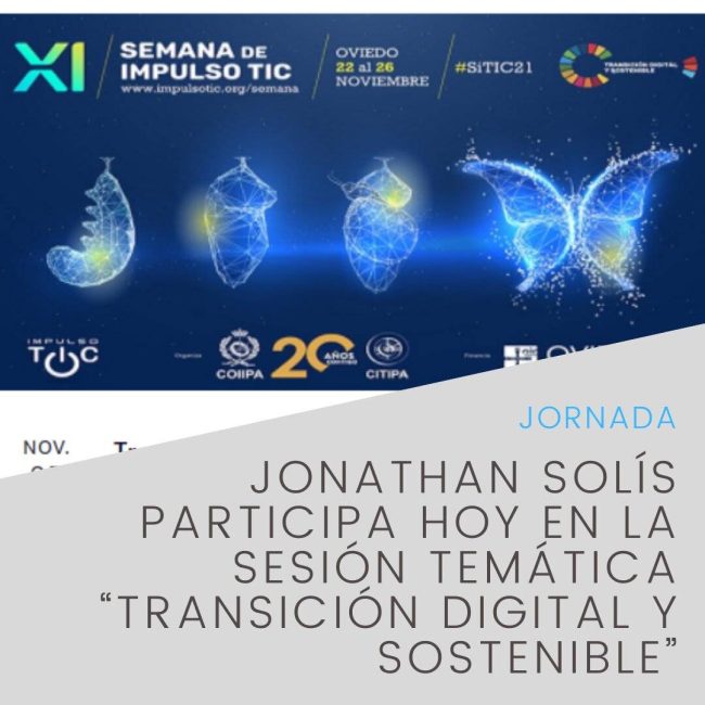 Nuestro CEO Jonathan Solís participa hoy en la sesión temática “Transición digital y sostenible” dentro de las actividades de la Semana de Impulso TIC organizada por los colegios de ingeniería informática del Principado de Asturias.