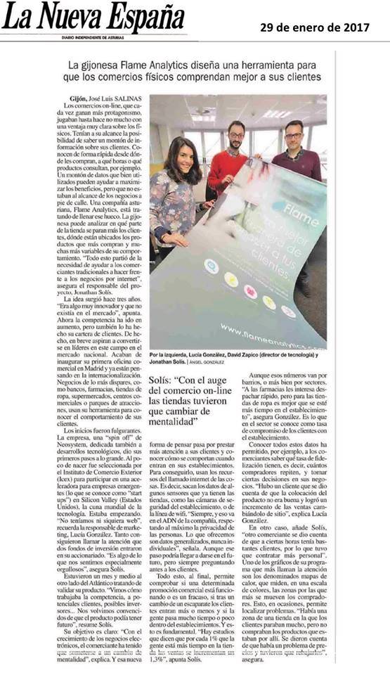 Este domingo Flame aparece en la sección de Economía del diario La Nueva España bajo el titular “Técnica frente a la tienda física”. En el artículo hablan de los inicios de Flame Analytics, y definen nuestro software como una herramienta para que los comercios físicos comprendan mejor a sus clientes.