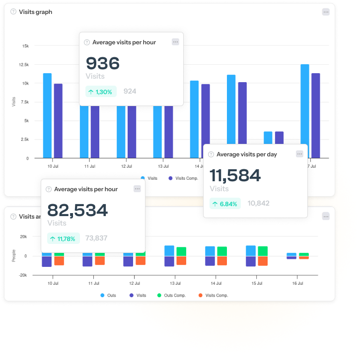 Mide con precisión la afluencia por horas, días, etc. Conoce la contribución de las distintas puertas de acceso. Descubre tendencias y patrones de tráfico comunes utilizando IA. Haz previsiones de afluencia. Averigua qué días y horas tienen mayor afluencia. Compara distintas ubicaciones por datos absolutos, relativos y de fecha. Mide el impacto de las promociones en la afluencia de público.