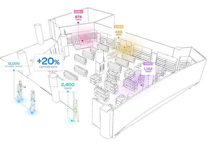 Mide el tráfico por plantas y zonas. Analiza y mide la conversión por zonas y, también, la duración de la visita.