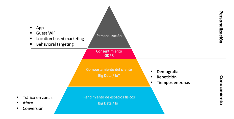 Te lo explicamos con esta pirámide dividida en cuatro partes. En la parte de abajo tenemos el rendimiento de los espacios físicos que vamos a hacer a través de la analítica. Vamos a poder medir el tráfico por zonas, medir conversiones y también ocupación / aforo de nuestras instalaciones. En un siguiente paso vamos a poder medir el comportamiento del cliente: datos demográficos, cuánto tiempo está en una zona concreta, si repite o no. Aquí tenemos que tener muy en cuenta que se trata de un conocimiento agregado y anónimo, en el que vamos a tener unos datos o kpis: por ejemplo, número de personas en una zona, horas puntas en la piscina, número de usuarios en el spa…